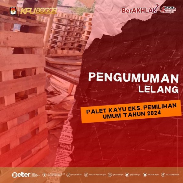 Komisi Pemilihan Umum (KPU) Kabupaten Bogor, melalui perantaraan Kantor Pelayanan Kekayaan Negara dan Lelang (KPKNL) Bogor, akan melaksanakan Lelang Non Eksekusi Wajib Barang Milik Negara (BMN). Objek lelang adalah 1 (satu) paket Palet Kayu Eks. Pemilihan Umum Tahun 2024 dengan rincian sebagai berikut: -Jumlah Barang: 2.830 (dua ribu delapan ratus tiga puluh) unit -Nilai Limit: Rp 11.320.000,- (Sebelas juta tiga ratus dua puluh ribu rupiah) -Uang Jaminan: Rp 1.320.000,- (Satu juta tiga ratus dua puluh ribu rupiah) Lelang ini terbuka untuk umum dan akan dilaksanakan secara open bidding. Link: https://drive.google.com/file/d/1JUeQhPiTiu50V3GSYIpmD37qOz3XbpTH/view?usp=sharing ....