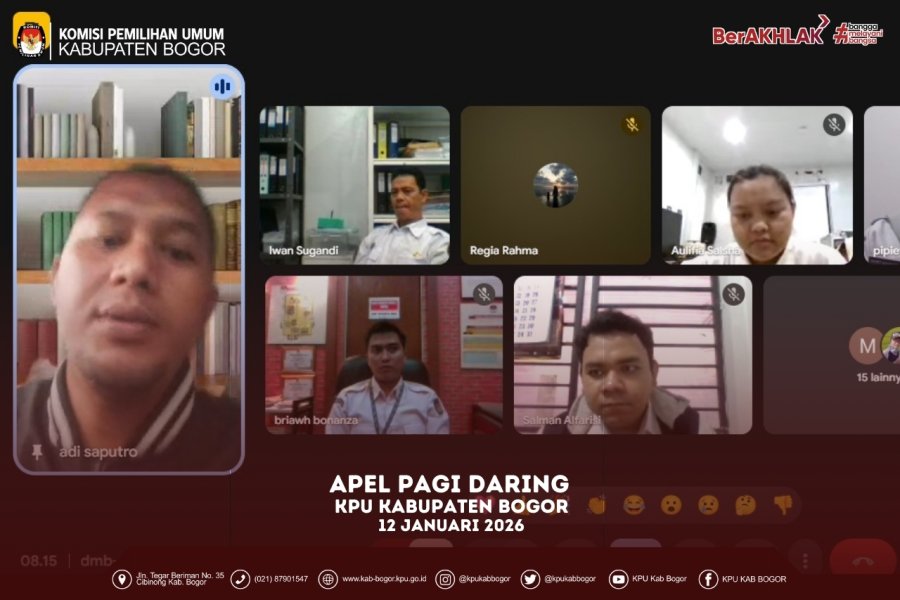 Cibinong — KPU Kabupaten Bogor melaksanakan apel pagi rutin pada Senin, 12 Januari 2026. Kegiatan ini diikuti oleh para Kepala Subbagian, Pejabat Fungsional, serta seluruh staf Aparatur Sipil Negara (ASN) di lingkungan Sekretariat KPU Kabupaten Bogor. Apel pagi dilaksanakan secara daring sebagai bentuk penyesuaian terhadap kondisi dan kebutuhan kerja, tanpa mengurangi makna serta esensi kegiatan. Senin pagi menjadi momentum penting untuk memperkuat integritas, kedisiplinan, serta koordinasi antarjajaran dalam mendukung pelaksanaan tugas kelembagaan. Meskipun berlangsung secara virtual, apel pagi tetap berlangsung khidmat dan penuh semangat. Seluruh peserta mengikuti kegiatan dengan antusias sebagai wujud komitmen bersama dalam mengawal demokrasi di Bumi Tegar Beriman. Melalui apel pagi ini, seluruh jajaran diingatkan untuk senantiasa melaksanakan tugas dengan penuh tanggung jawab, profesionalisme, serta menjaga semangat kebersamaan demi mendukung kelancaran tahapan Pemilu dan Pemilihan ke depan. Apel pagi rutin menjadi sarana konsolidasi internal yang penting, sekaligus pengingat akan peran strategis setiap insan KPU dalam menjaga kualitas demokrasi yang berintegritas dan terpercaya. ....